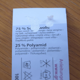 Für diese Sockenwolle besagt sie, dass sie bei 40°C im Schonwaschgang gewaschen werden kann; dass man sie nicht bleichen und auch nicht in den Wäschetrockner stecken sollte. Man kann die Wolle auf Stufe 1 des Bügeleisens bügeln und auch einer schonenden ChemischenReinigung unterziehen.